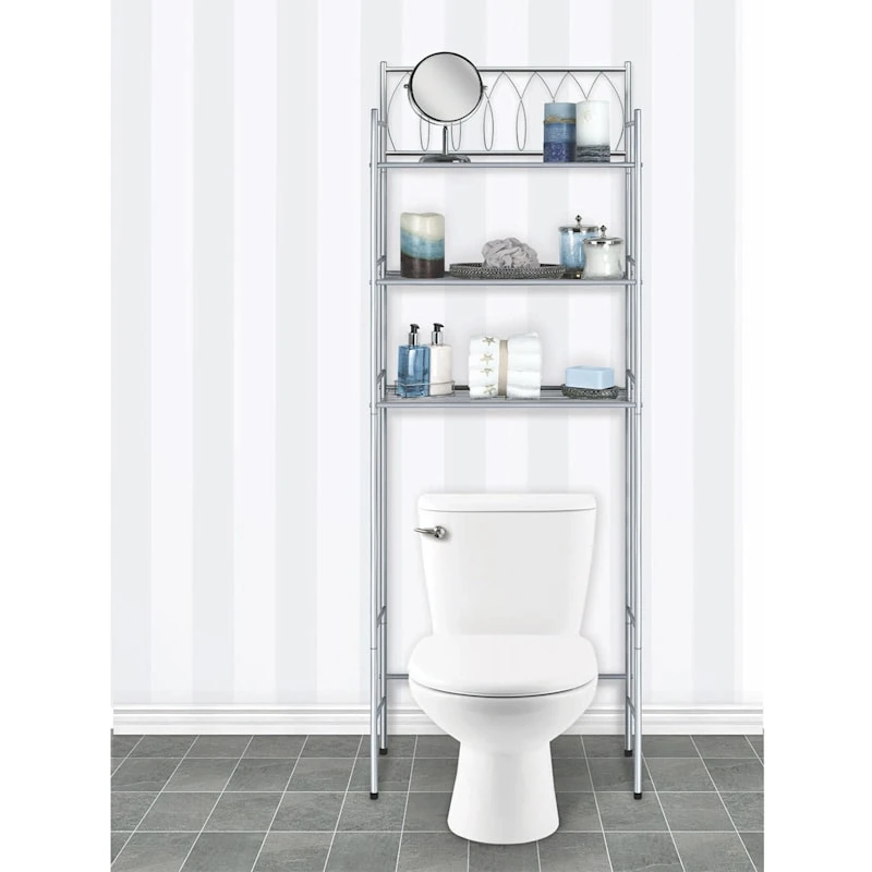 A tiny, cramped bathroom is always a challenge. Need a little extra storage space, want to clear off the countertop? Our 3-tier over the toilet space saver shelving is the ultimate problem solver. This multipurpose rack is the perfect storage solution for towels, tissue, ornaments and makeup essentials. And the decorative silver scalloped detailed metal styling brings a bathroom to life.